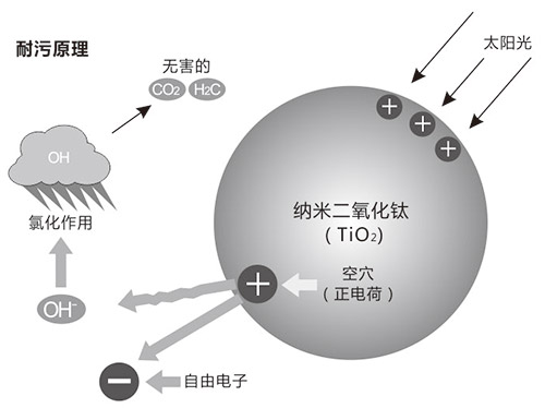 由機(jī)硅改性無(wú)機(jī)高分子合成樹(shù)脂和特種添加劑組成的水性罩面涂料,該產(chǎn)品有很強(qiáng)的光觸媒效應(yīng),涂膜吸收陽(yáng)光的紫外線后,使表面達(dá)到超親水性,可分解涂膜面污物,具有自潔功能