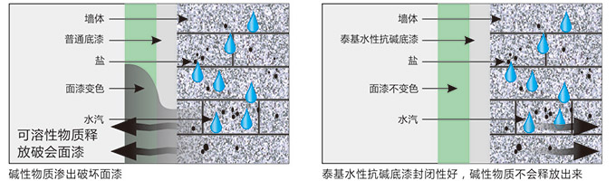 泰基漆在大量實踐中發(fā)現(xiàn),由于常規(guī)性底漆抗堿性能非常有限,使得墻面條件變化以及施工的疏忽,都可能引起底漆封閉失效,從而導(dǎo)致面漆褪色、脫落。為此泰基漆推出了功能特異的抗堿底漆,此底漆通過丙烯酸分子鏈上接技環(huán)氧基因而改性,增強了傳統(tǒng)底漆的抗堿、抗鹽的功能。